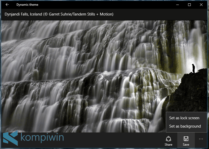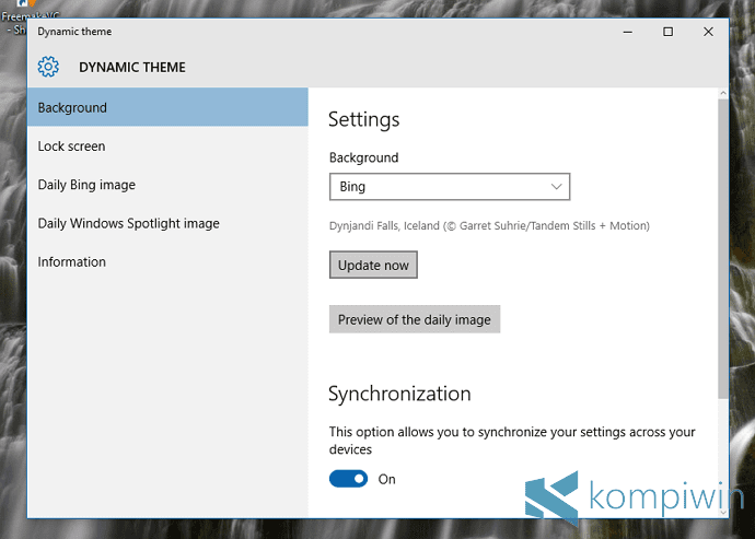 Kamu mungkin tahu aplikasi Bing Desktop Toolbar yang dapat melakukan hal yang sama – namun terlalu berlebihan jika hanya untuk menampilkan wallpaper Bing di desktop. Dengan Dynamic Theme, kamu juga bisa menampilkannya di lock screen, sinkronisasi ke semua perangkat Windows, dan menyimpan wallpaper-nya.