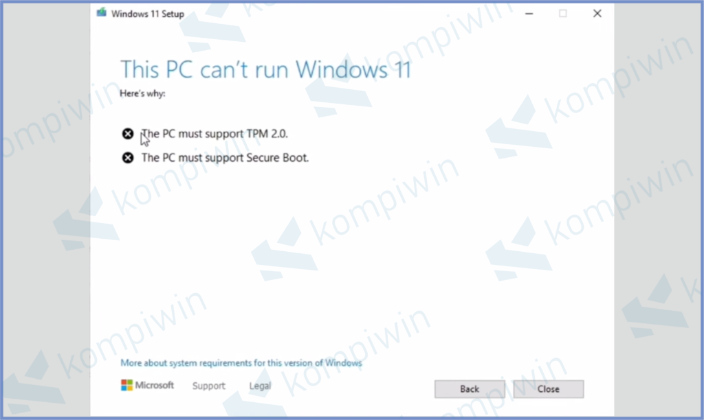 Jika tidak support TPM 2.0 maka akan muncul notifikasi “The PC Must Support TPM 2.0“. Apabila kamu mengalami permasalahan tersebut, kamu bisa ikuti tips mengatasi The PC Must Support TPM 2.0 Saat Install Windows 11.