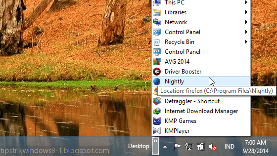 Untuk menambah menu pada toolbar ini, Anda hanya perlu menambahkan pintasan ke Desktop. Pintasan pada Desktop akan tampil sebagai menu pada toolbar ini.
