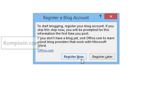 Lalu muncul editor pos. Klik “Register Now” untuk mendaftarkan blog Anda ke Microsoft Word.